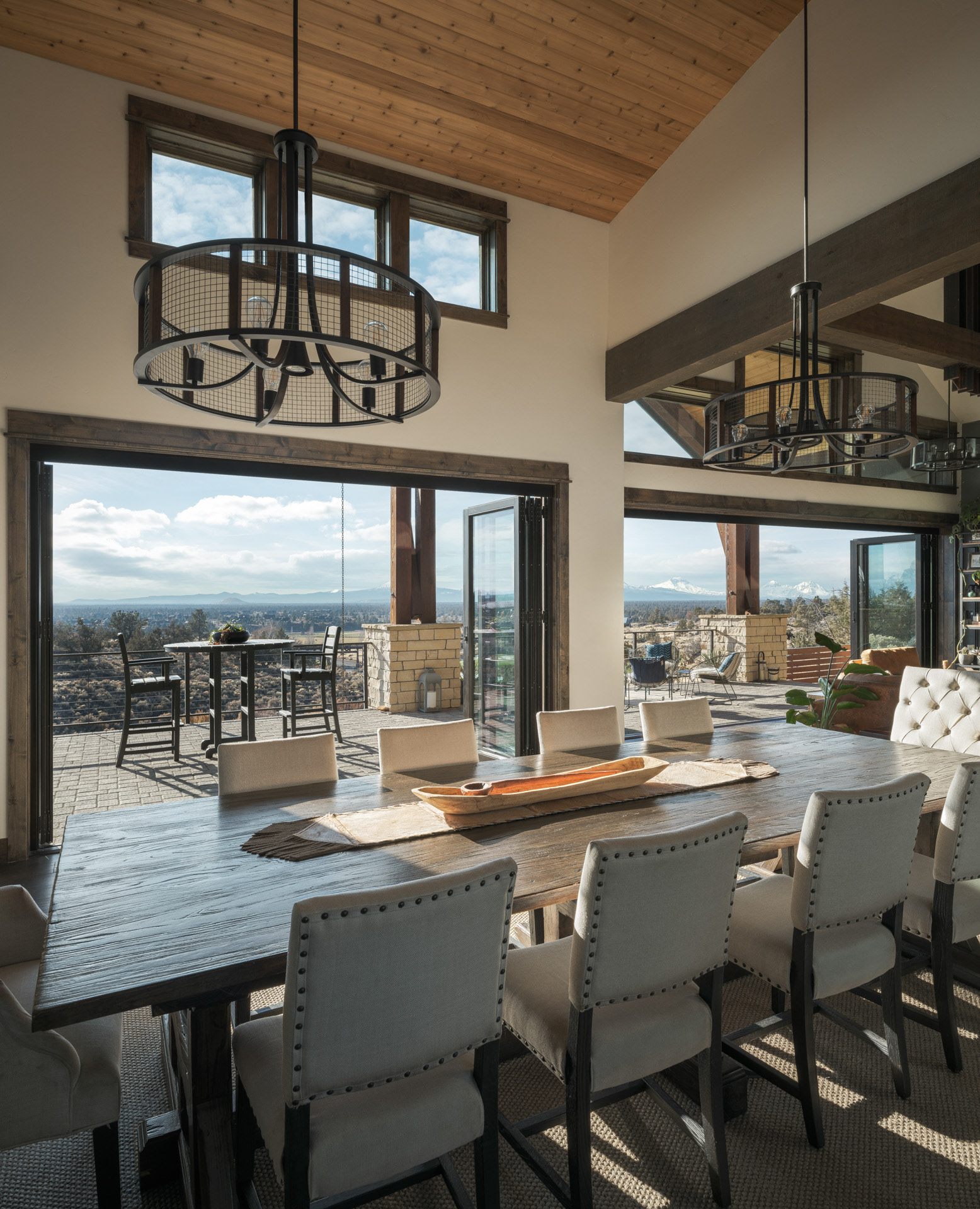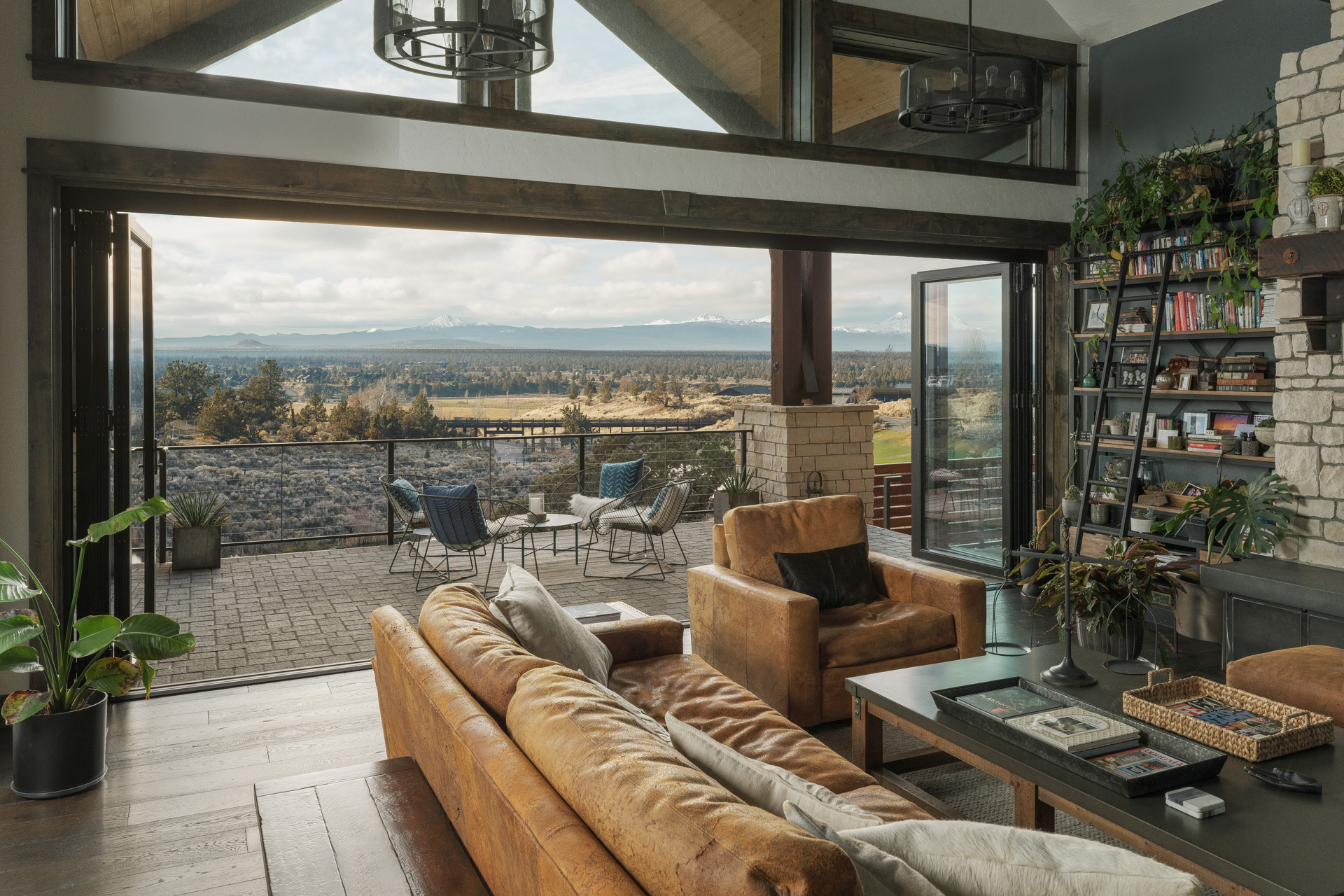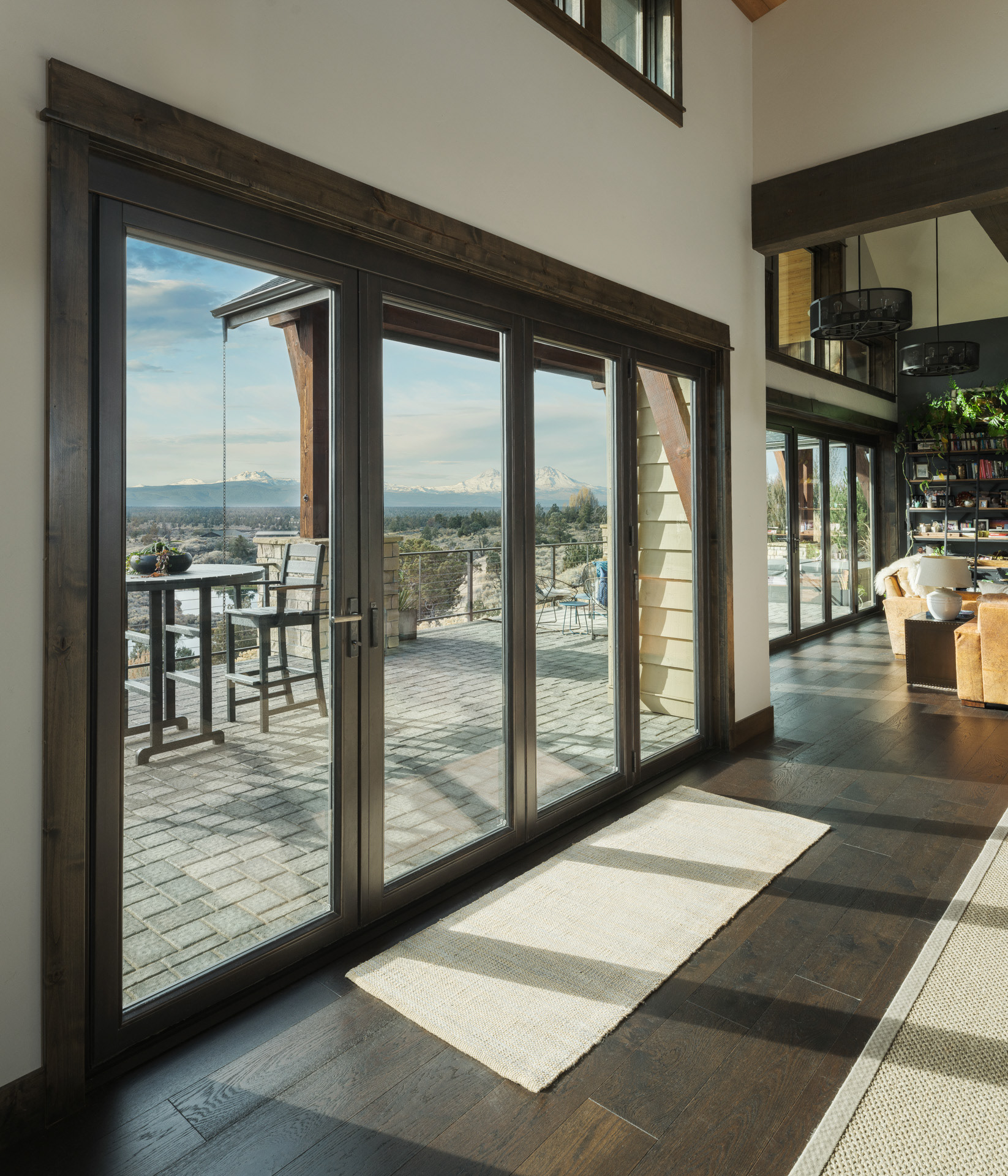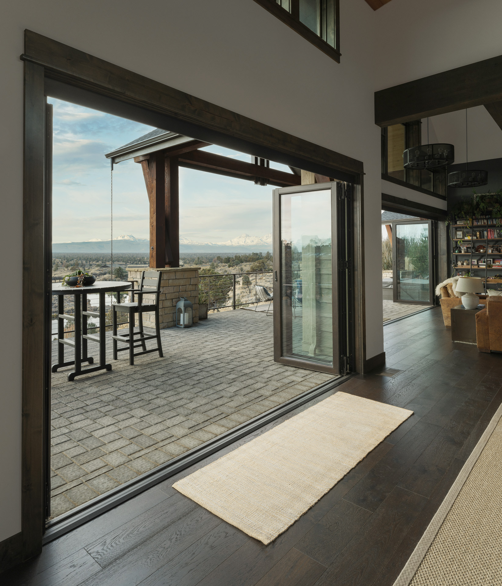 Commissioned by NanaWall, this Central Oregon residence with cascade mountain views takes full advantage of the surrounding high desert landscape through immersive opening glass walls, significantly expanding the living space and bringing the outside in.