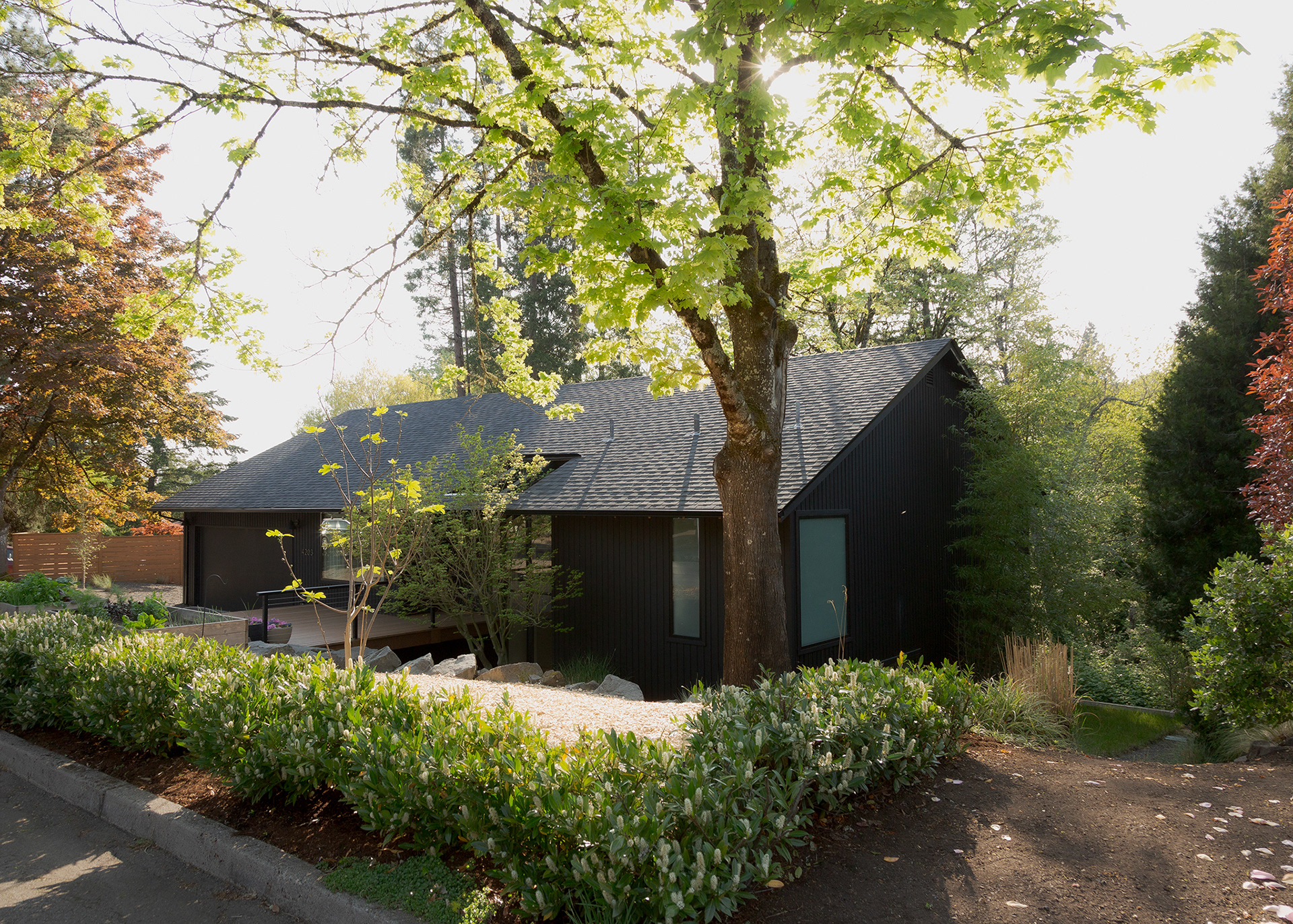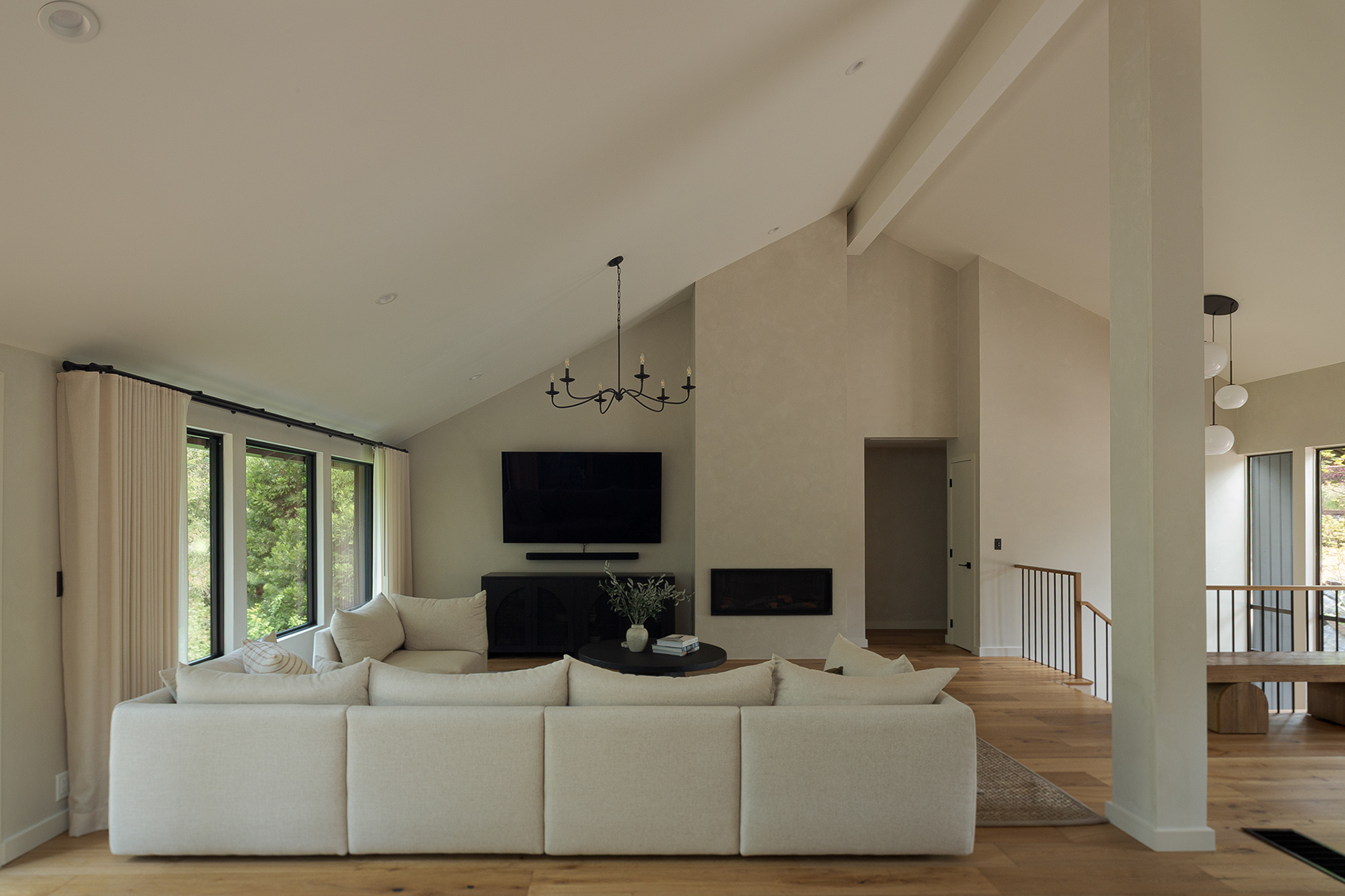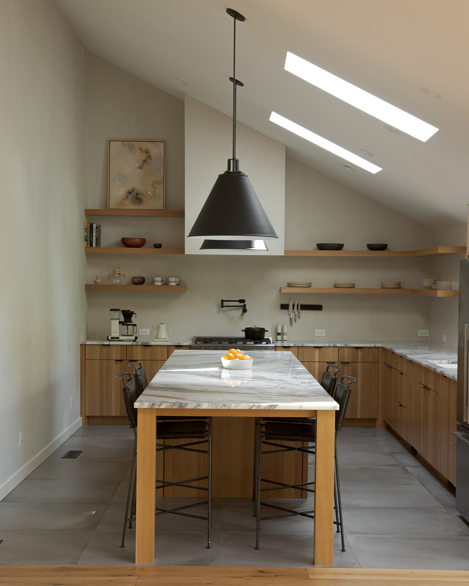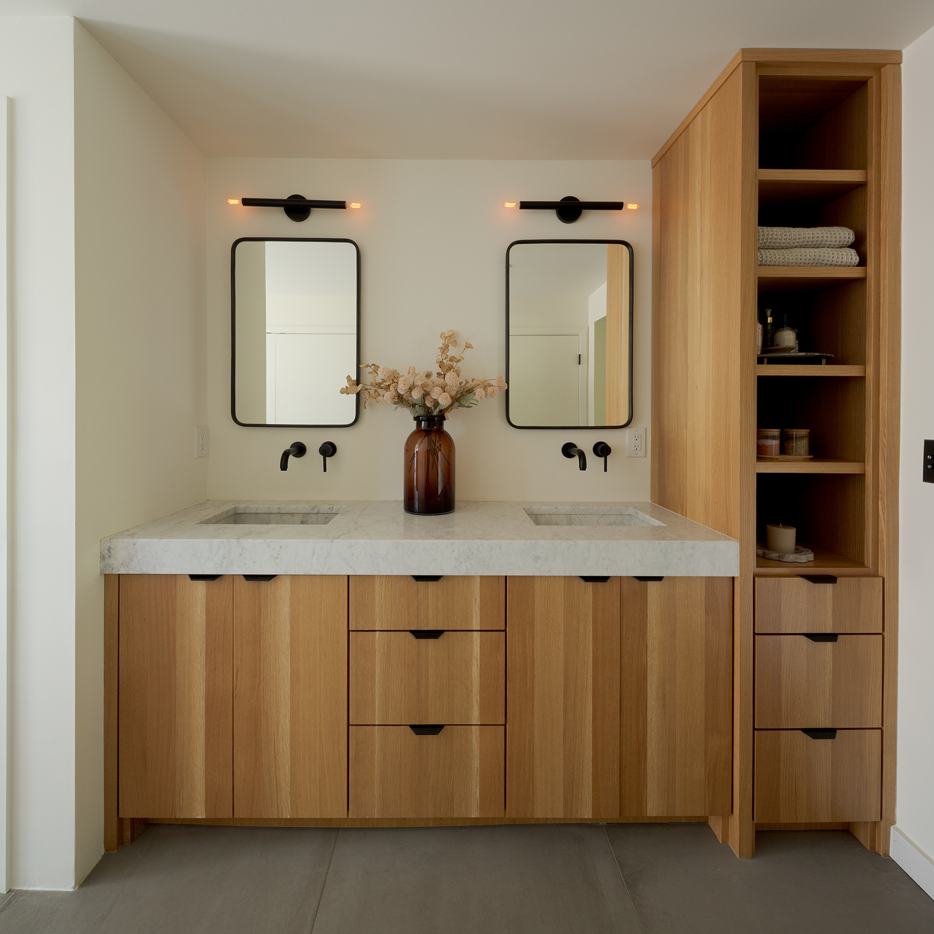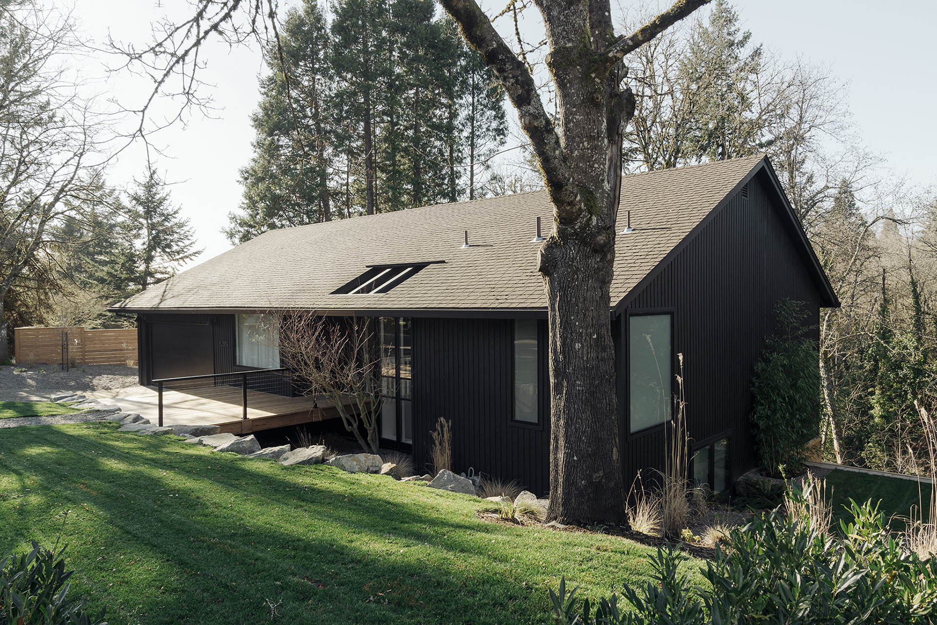 A home in the west hills of Portland documented at two distinct times. First photographed for Dune Homes after a down-to-the-studs remodel, the home was later re-photographed following additional interior design by Recast Homes, where subtle shifts towards darker tones and augmented materiality reflect the homeowner’s evolving vision.