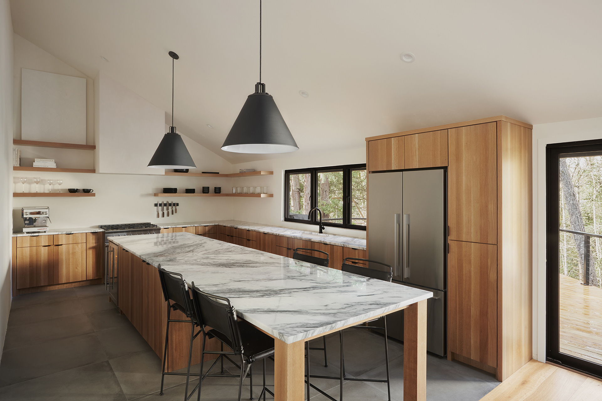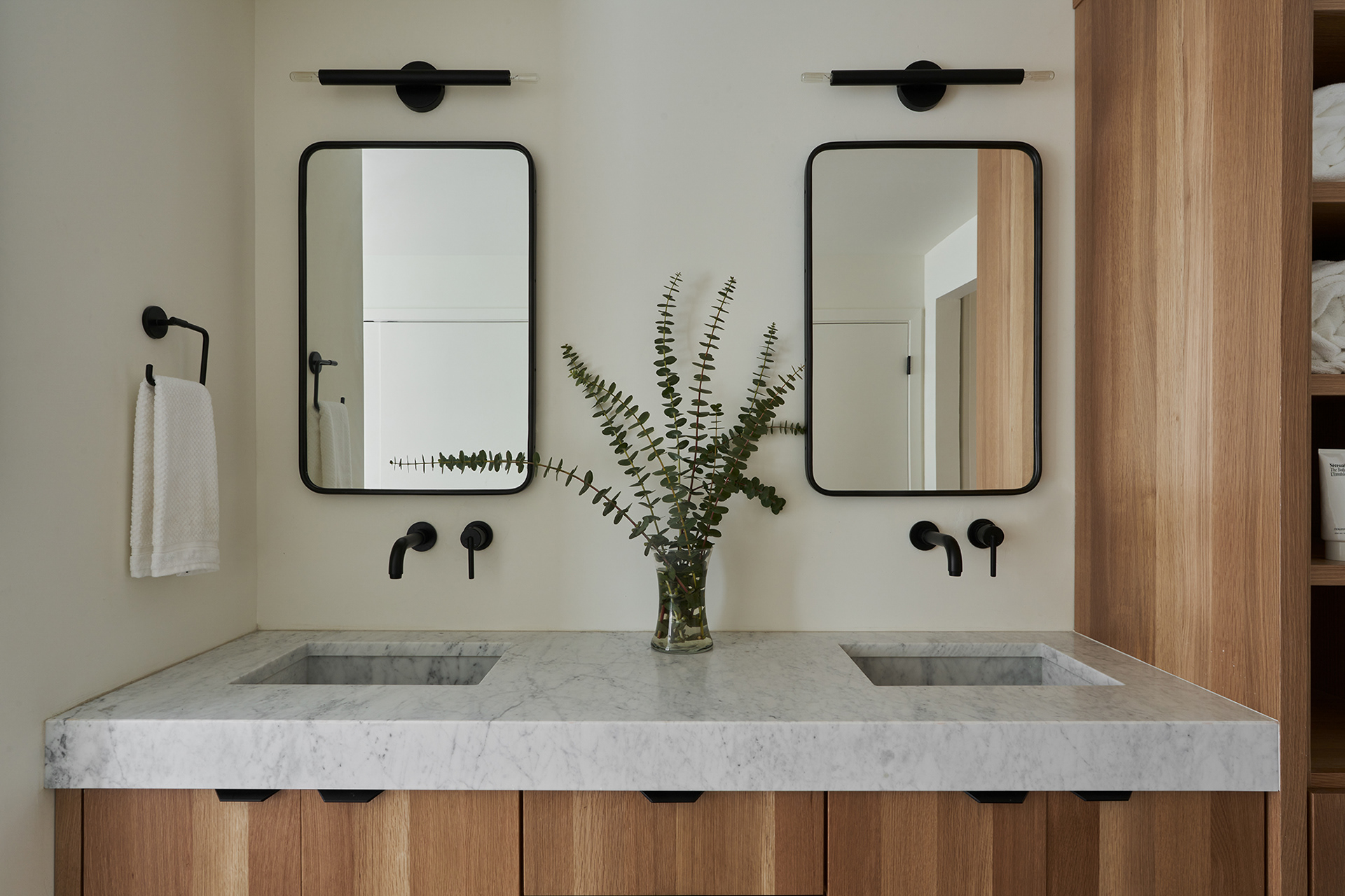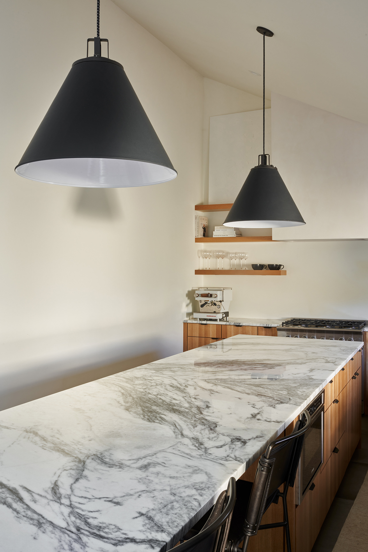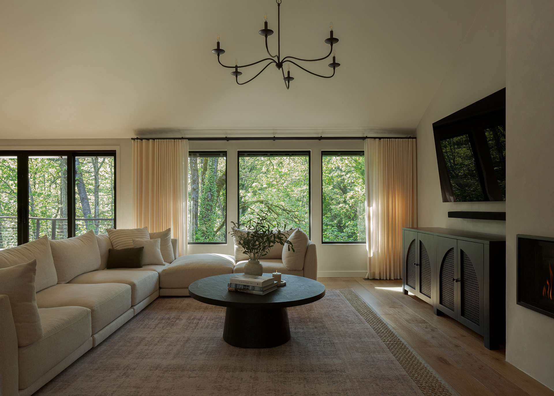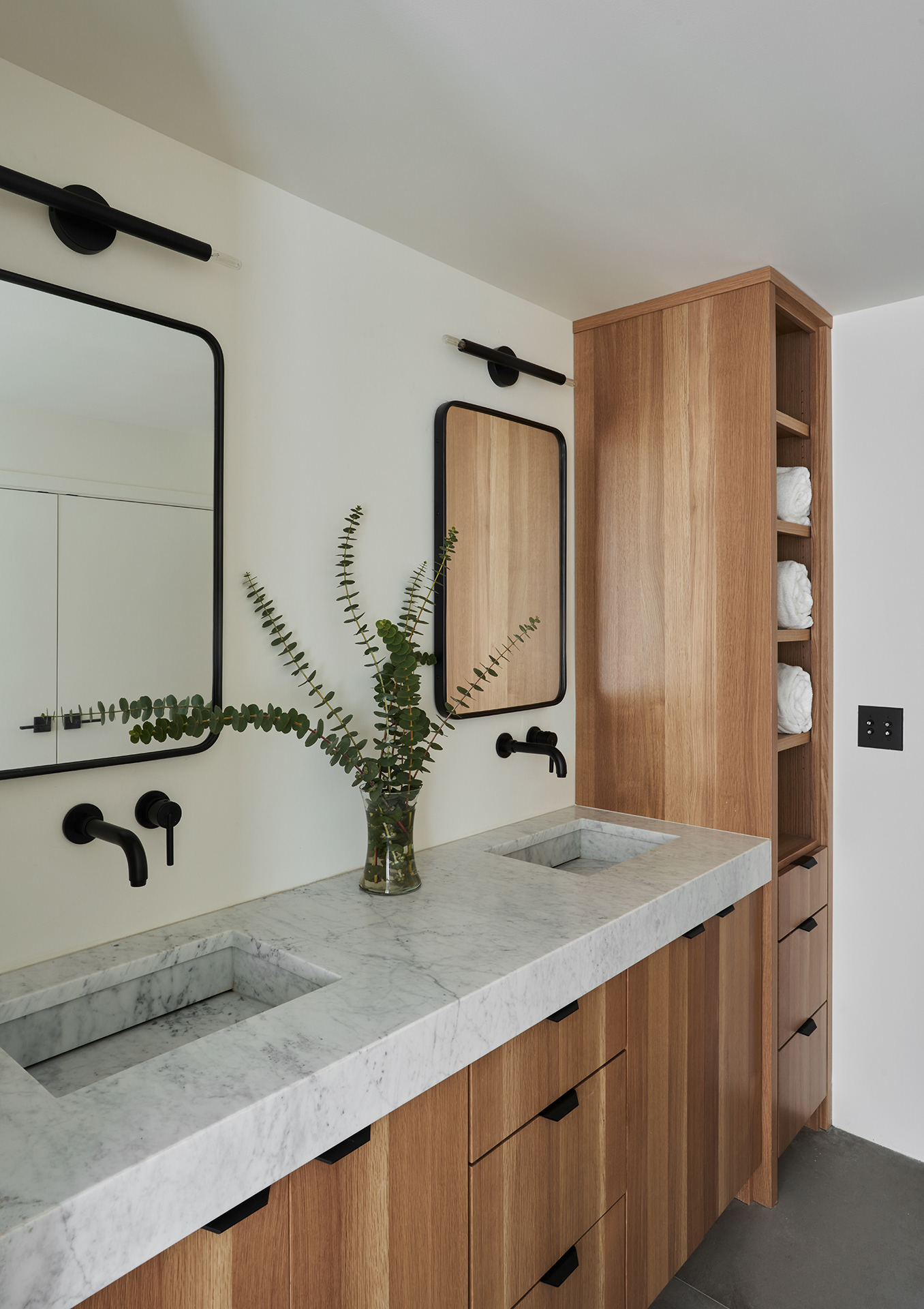 A home in the west hills of Portland documented at two distinct times. First photographed for Dune Homes after a down-to-the-studs remodel, the home was later re-photographed following additional interior design by Recast Homes, where subtle shifts towards darker tones and augmented materiality reflect the homeowner’s evolving vision.
